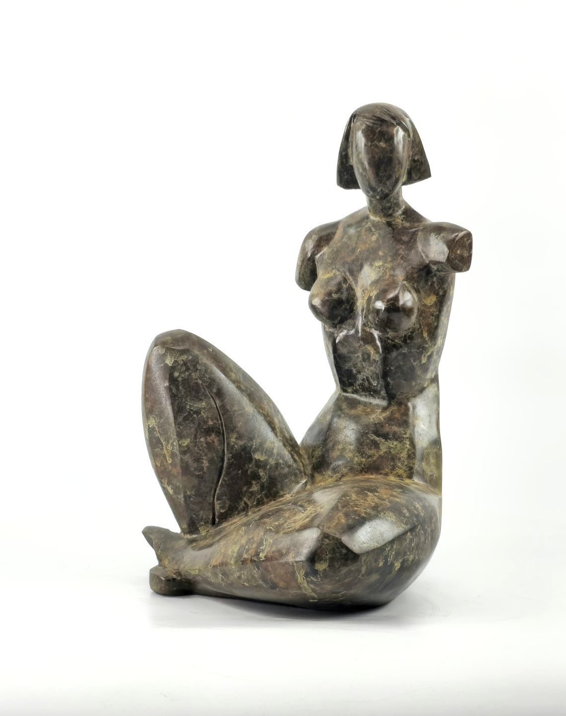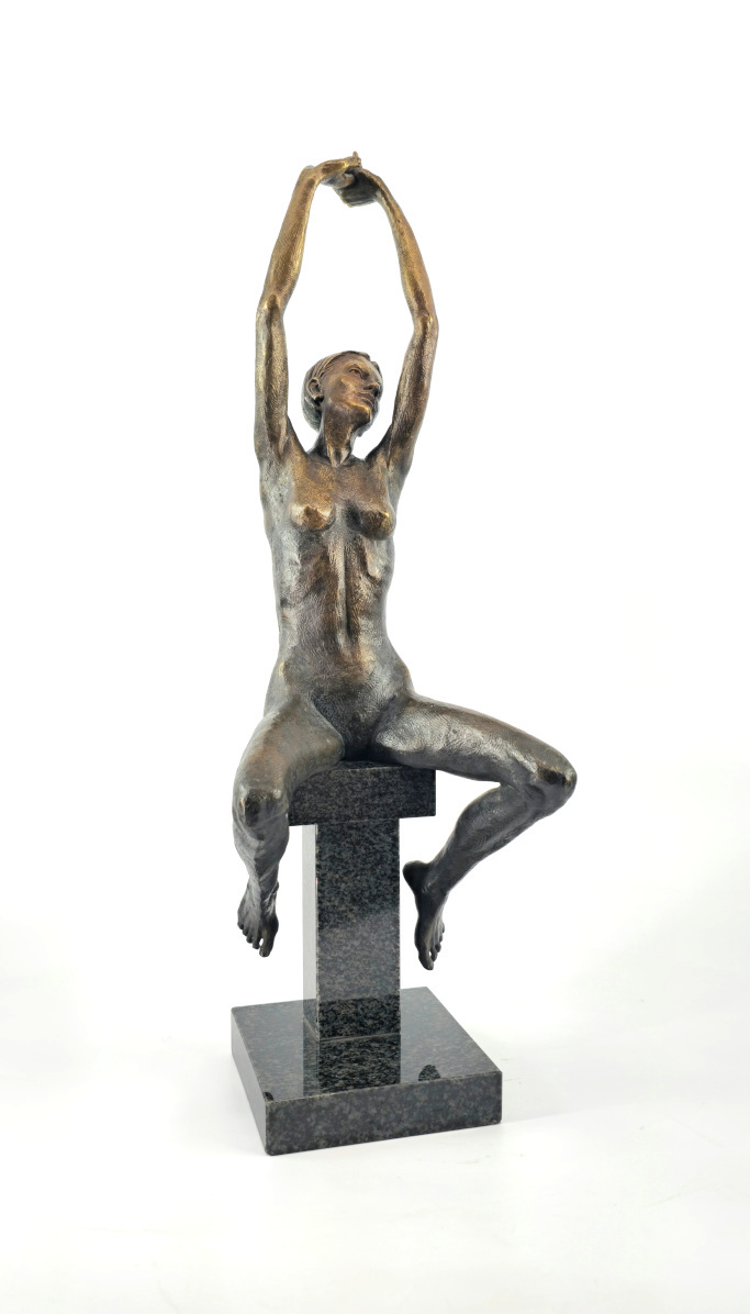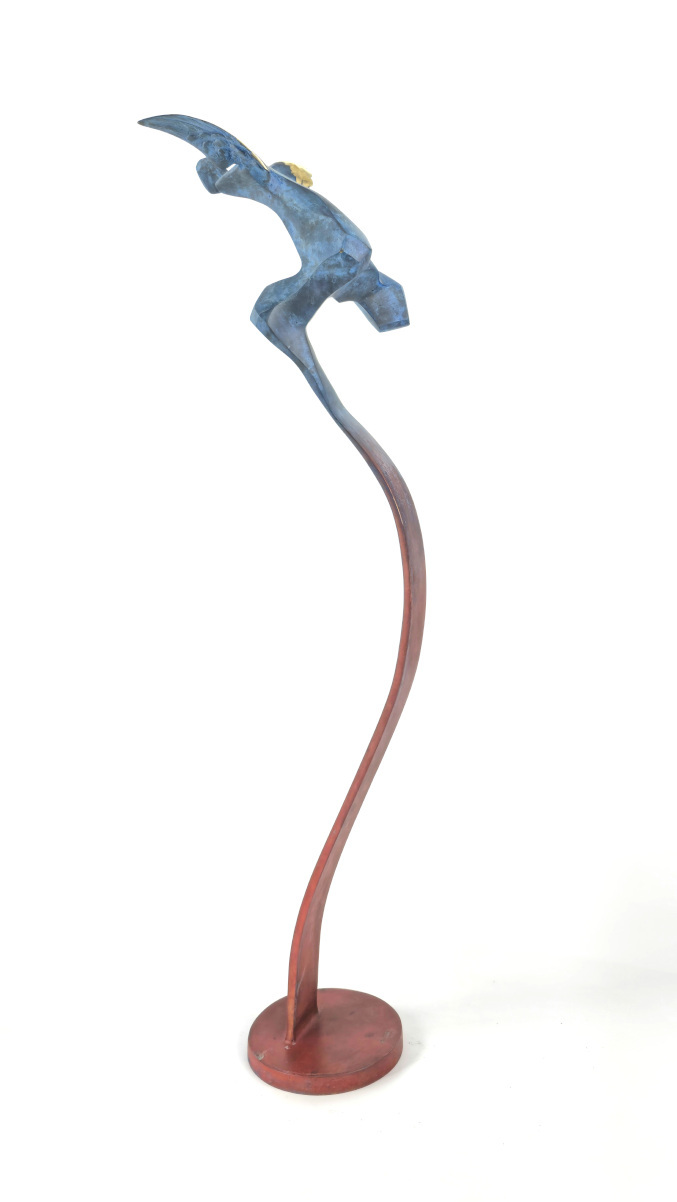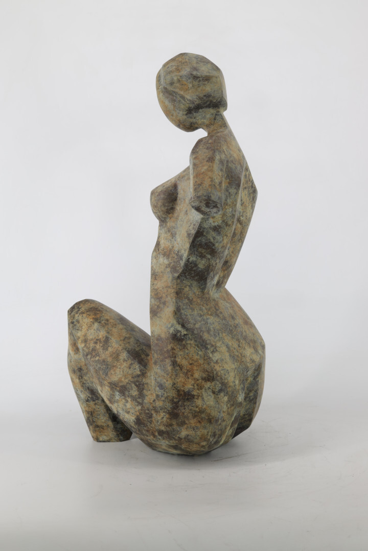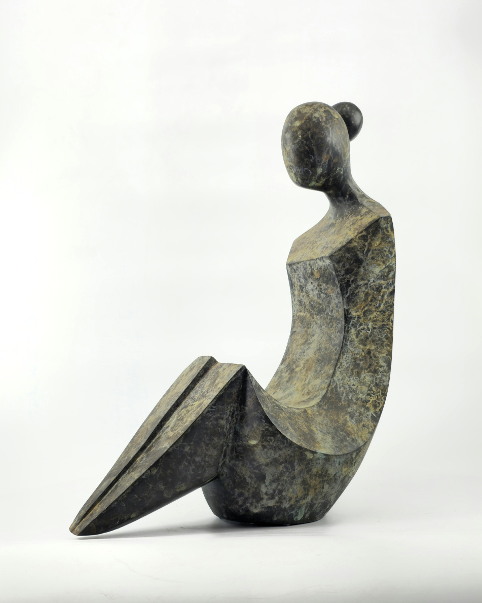 Rzeźba geometryzująca wykonana metodą wosku lanego odlanego w brązie. Rzeźba patynowana.